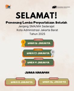 Akhirnya Perpustakaan SMKN 9 Jakarta meraih juara ke 3 dalam kegiatan LOMBA PERPUSTAKAAN Tk. Jakarta Barat Tahun 2025
